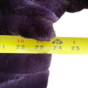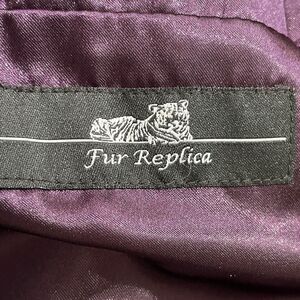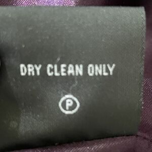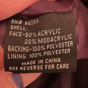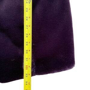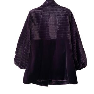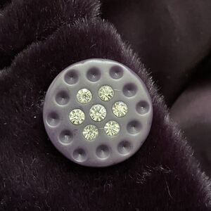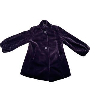 This coat is a statement piece in a stunning deep purple color with 2 large faux buttons with rhinestones. Actual closure is a metal hook and loop style (see photos). One of the faux buttons seems to be a bit loose.