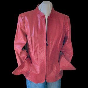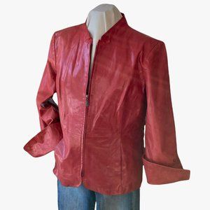 Pamela McCoy Genuine Red Leather Jacket L Front Zip Stand Collar Turn Back Cuffs