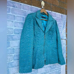 Pamela McCoy Turquoise Cheetah Leopard Print 100% Leather Full Zip Jacket medium