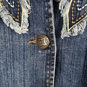 -Unique, stunning embroidered jean jacket with matching jeans. Both are size large. Given that this is vintage, please review measurements to ensure fit.