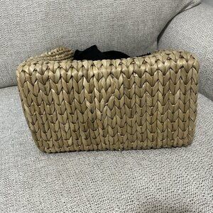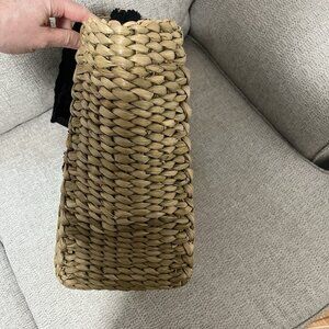 Handwoven, natural cornhusk tote with signature fringe grosgrain ribbon knot handlesLined in cotton with one interior pocketColor: BlackHeight: 12.5"Length (Top Opening): 16.0"Length (Base): 11.5"Depth: 7.5"Handle Drop: 9.5"Cannot support more than 20 lbs.