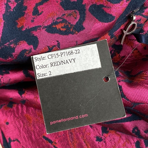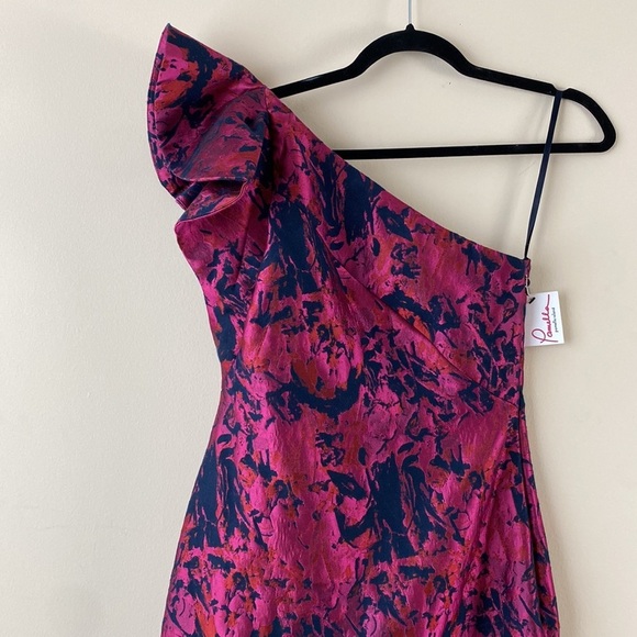 Pamella Roland Pink Navy Blue One Shoulder Floral Jacquard Evening Column Gown