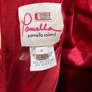 Stunning scarlet gown by Pamella Roland. Features a deep V-neck and elegant silhouette. Ideal for formal events.