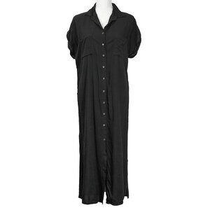 Pampelone Black Shirt Dress Goth Minimalist Quiet Luxury Classic Button Up Midi, size medium. The Pampelone black shirt dress buttons up and have a casual yet sophisticated and classic vibe that feels effortless. It has a quiet luxury and minimalist vibe that is classy and perfect for the office, day wear, or a girls night out. It is sexy yet understated.