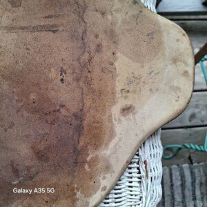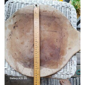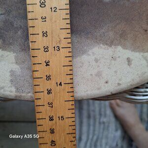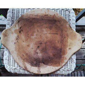This pizza pan is becoming well-seasoned. She is looking for a new home to continue her seasonings. Surface shows significant discoloration and wear from previous use. Measurements: Diameter = 15 inches; Handle to handle = 17.5 inches.