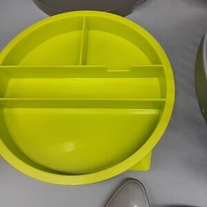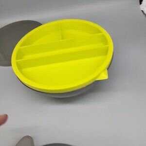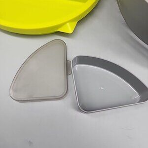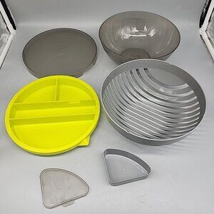 The Pampered Chef 6 Piece Salad Cutting Bowl Set is a collection of plastic bowls designed for convenient salad preparation and storage. With a solid green color and a round shape, these bowls feature a snap lid for easy access. Perfect for keeping your salads fresh and organized, this set includes items from the Pampered Chef franchise, known for quality kitchen products. Each bowl has dimensions of 8.5x4 inches, making it a versatile addition to any kitchen storage and organization collection.