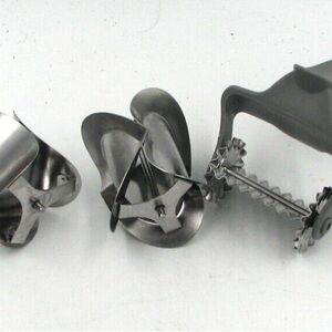 Versatile rolling cutter set by Pampered Chef. Includes multiple silver pieces for various uses.