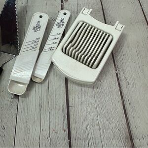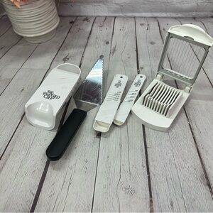 Essential kitchen tools by Pampered Chef. Includes slicer, server, and cutter. Sleek white design.