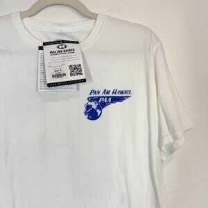 Step back in time with this Malibu Shirts Authentic Vintage Apparel Pan Am Hawaii PAA graphic t-shirt in size Small. Featuring a distressed-style blue Pan American Airways logo on the front and a stunning full-color “Fly to Hawaii via Pan American” vintage travel poster graphic on the back, this shirt celebrates the golden age of air travel. New With Tags.