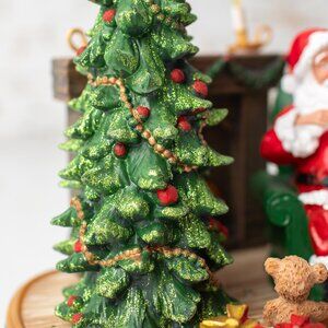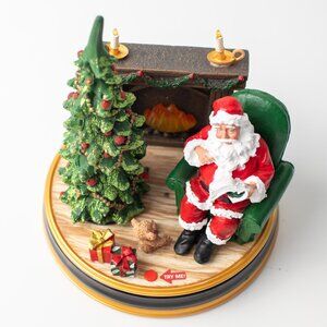 Celebrate the warmth of the holidays with this charming Pan Asian Creations 2002 Santa Figurine. The piece features Santa Claus seated in a green armchair by the fireplace, reading his list beside a glittering Christmas tree adorned with garland and red ornaments. The base includes a “Try Me” button and a built-in speaker that plays "Twas the Night Before Christmas" while the scene lights up, bringing cozy Christmas charm to any display.
