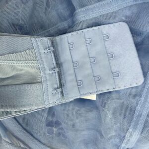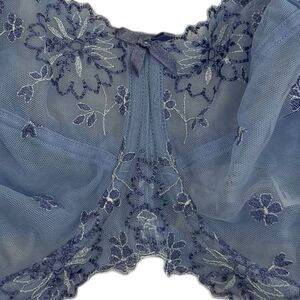 The Ariza bra features cups made of sheer mesh and adorned with beautiful floral embroidery with a Swiss design. There is delicate embroidery along the top of the cups and bottom of the center panel.