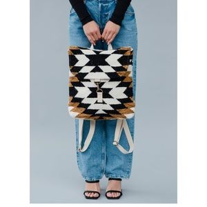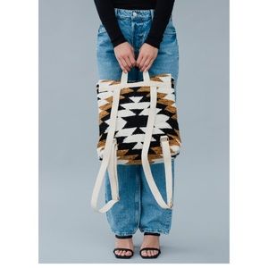 Thick 80% wool 20% cotton aztec print backpack. Brand new still in the original packaging. It’s a well made bag and beautiful colors and print. I am allergic to wool so I cannot use this bag.