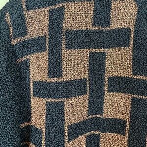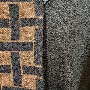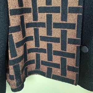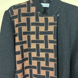 Panache Black/Copper Art-to-Wear Fiber Artist Funky Hand Woven Jacket with 2 Button Front Closure; Size Medium; When lying flat, measures 23” pit to pit and 24.5” in length from top of collar to bottom hem; Handwoven Fabric Composition Unknown; Dry Clean Only