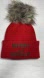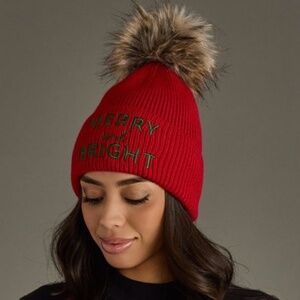Red knit pom hat Green embroidered "Merry and Bright" on the cuff Natural faux fur pom accent Fleece lined 100% Acrylic