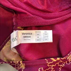 “Veronica” burgundy and gold paisley one piece swimsuit from Panache features a hidden underwire bra, asymmetrical ruching on the tummy, and a tie detail at the neckline.