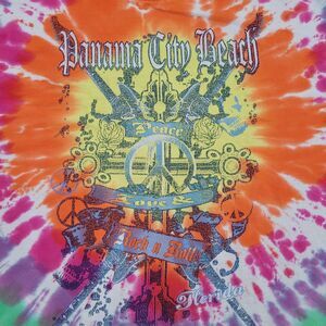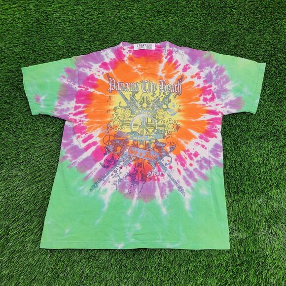Panama City green tie-dye shirt, medium 20x26. Vintage peace and love graphic tee with bold retro beach vibes and hippie spirit. Shop now!