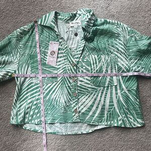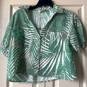 Elevate your style with this chic green palm leaf print top. Perfect for any occasion, this top offers a fresh and vibrant look.