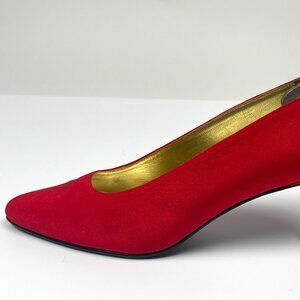 Elevate your wardrobe with these stunning Pancaldi 1888 high heels, a true testament to Italian craftsmanship. The vibrant red fabric upper adds a pop of color to any dress, ensuring you stand out in the most sophisticated way. They are in overall good condition, with few minor imperfections and light stain ( see photos for details). Size 7 AA, ( inside label 7.5)