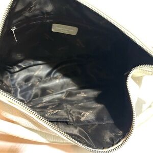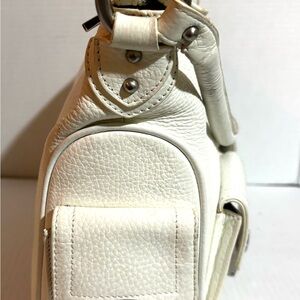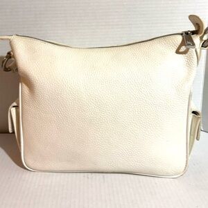 This chic cream leather hobo bag is a stylish addition to any wardrobe. Its versatile design and elegant color make it perfect for everyday use. Main compartment open compartment 3 pockets at interior wall 1 zip pocket closure at interior wall fabric lining 2 pockets at front pocket at side exterior have marks stains hight 10” wide 10” depth 4” strap drop 11”