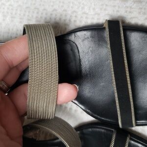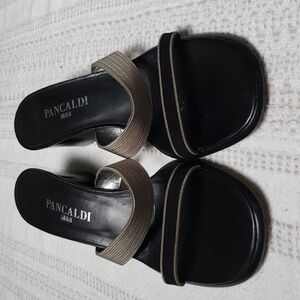 Pancaldi silver black chunky heel slip on sandals, Mini chain detail on strap, unique summer shoe, classic mule double strap shoe, women's size 8