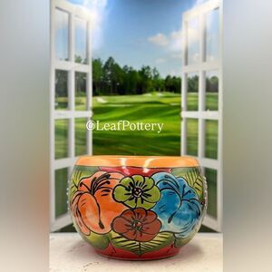 Dimensions: 6.5”H x 9”W, Opening 7.25”, weight 4lbs 11.6oz, Drainage Hole, Add a bright spot to your home or patio with this Talavera planter. This unique Mexican planter is the perfect home for your medium houseplants or a dazzling displaying Mexican paper or corn husk flowers. Handmade and hand painted by talented artisans in Mexico. Don’t forget to dress up your plants 🪴