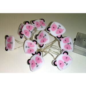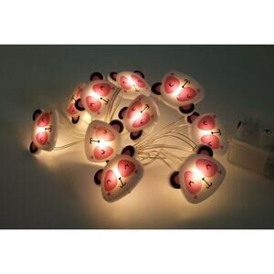 From Greenbrier is this set of LED string lights on silver wiring featuring a white and pink Panda face. The lights are battery powered. The strand measures 3.6 feet. There are 10 lights on the strand.