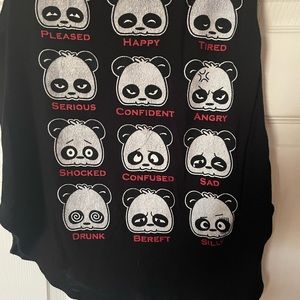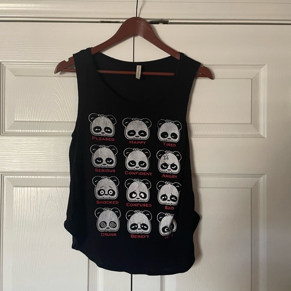 Tank top from Pink Berry. Juniors medium. Rayon/ spandex blend. Panda emotions graphic. In very good used condition. Normal wear on graphic. No holes or tears. Smoke-free home.
