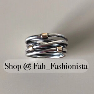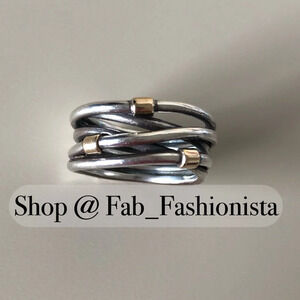 This sterling silver ring is comprised of a number of intertwined sterling silver hoops and features three areas of solid 14K gold that serves to accentuate the design