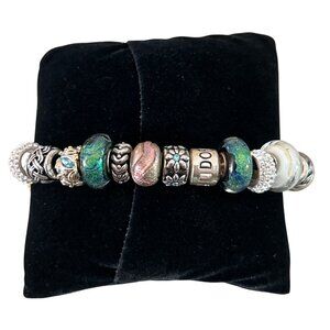 Pandora 925 Black Leather Charm Bracelet With Mixed Beads Glass & Stud Accents