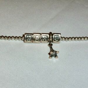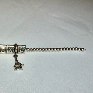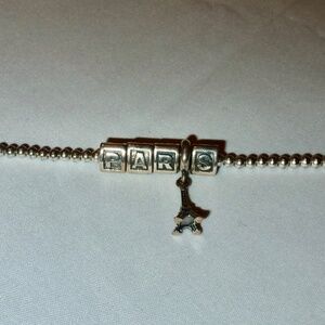 Pandora 925 Sterling Silver Five (5) Charm "Paris" Bracelet. Charms are 925 Sterling Pandora, bracelet is 925 Sterling Italy beaded bracelet. The Eiffel Tower Charm has been substituted for the letter "I" (thank you to my friend J for the idea!). Measures 7" end to end.