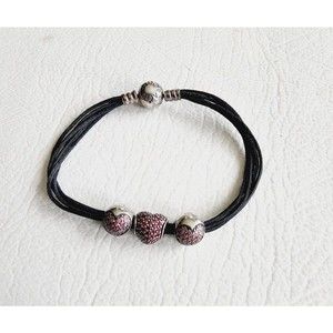 Pandora 925 Textile Multi String Bracelet Pink Pave CZ Heart / 2 Heart Clips.