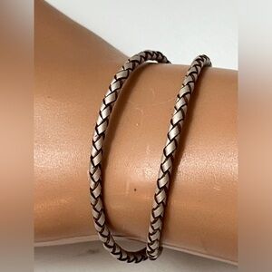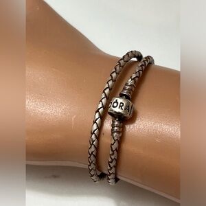Pandora Brown & White Braided Leather Sterling Silver Clasp Double Wrap Bracelet excellent condition