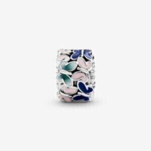 Add a dose of colour to your look with this clip charm hand-finished in sterling silver. Detailed with a swarm of butterflies, the meaningful charm features vibrant hand-applied enamel. It's the perfect piece to create a garden-inspired look on your favourite bracelet. Wear the clip charm to help you evenly space your chosen charms with style. This clip charm features no silicone grip, so it will slide if not styled onto threads (two raised charm dividers). Compatible With Pandora Moments Collection Pandora Moments Metal Sterling silver Material Enamel Product type Charms Item 797863ENMX Dimensions: Depth: 11mmHeight: 11mmWidth: 8mm