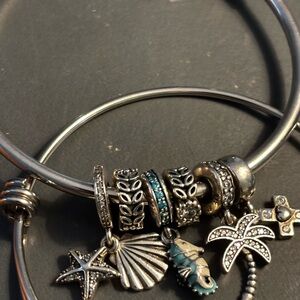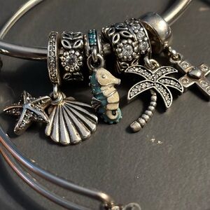 Sterling silver pandora charms and pandora snake chain bracelet . featuring sea life designs and spacers . Includes starfish, shell, seahorse , cross and palm tree charms with blue accents. Bonus not pandora - turtle bangle. Looks great together all in excellent condition
