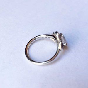 Ring in sterling silver with 1 claw-set cushion-cut clear cubic zirconia and 16 bead-set clear cubic zirconia.