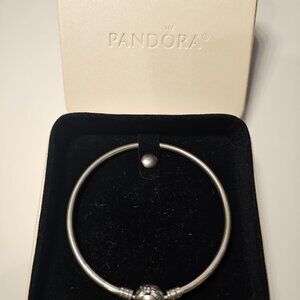 Sleek and elegant, this Pandora Moments bangle is simply beautiful. Crafted in polished sterling silver, it is finished with an embossed ball clasp. Wear this Pandora bangle on its own or create your dream bracelet by adding your collection of Moments charms.