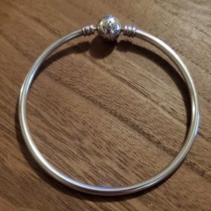 Pandora sterling silver, ball clasp bangle, marked S925 ALE. Wear alone or with your favorite charm beads. 1st 3 pictures are stock. Others are actual item. EUC, very little signs of wear. APPROXIMATELY Diameter-2.5," 3mm-width, 7.5"-circumference.