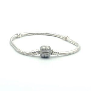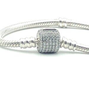 Authentic 7.5-Inch Pandora Moments Sterling Silver Sparkling Pave Clasp Snake Chain Bracelet 590723CZ Retired. This classic Pandora sterling silver charm bracelet features a barrel clasp adorned with sparkling clear Cubic Zirconia. A beautiful way to wear your favorite charms.
