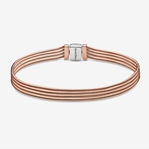 Wear the Pandora Reflexions Multi Snake Chain Bracelet alone or loaded with clip-on charms. The two-tone design comes to life when styled with your favourite symbols. The four individual snake chain strands are hand-finished in 14k rose gold plating, while the clasp is made from sterling silver and provides a cool contrast to the warm tones of the rose gold-coloured finish. Wear it stacked with other Pandora Reflexions bracelets or alone for a statement look.