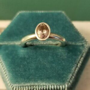 Pre loved pretty Pandora ring. The oval-shaped lab-created amethyst stone is set on a sterling silver band. The solitaire setting style and stackable feature make it versatile for any occasion. This ring is made with sterling silver of 925 metal purity.
