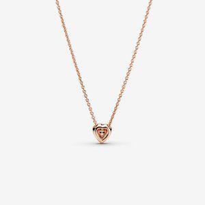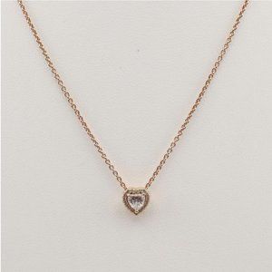 Sparkling Heart Collier Necklace. Hand-finished in 14k rose gold plating, this necklace is inspired by classic design elements from the Pandora Timeless collection. Featuring a raised heart-shaped central stone surrounded by a halo of clear cubic zirconia, a Pandora crown O monogram logo tag is attached by the clasp. Adjust the necklace length to suit your style and wear with other heart-shaped pieces for a look filled with love. Grest condition.