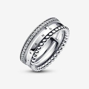 A sophisticated finishing touch to any outfit. Crafted in sterling silver, the Pandora Signature Logo Pavé & Beads Ring features a multi-textured look with contrasting bands of beads and pavé. The Pandora logo is inscribed on the polished middle band. Wear it with the beaded side up or the other way around for a subtle variation to your look.