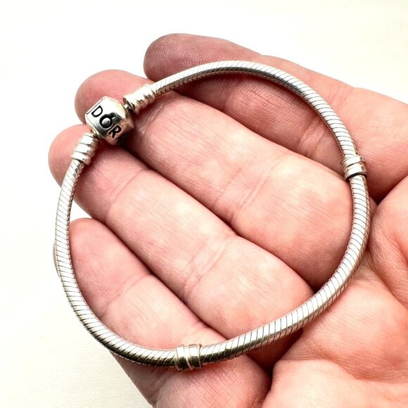Stylish silver bracelet by Pandora. Features a distinctive charm clasp.