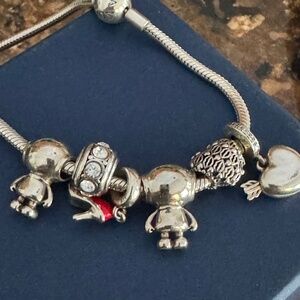 Silver charm bracelet with 6 charms. Authentic Pandora see clasp. Individual charms may be purchased at 40.00. Make your bid. In the comments list the one you want. I’ll confirm bid and message you in the sale function.