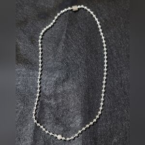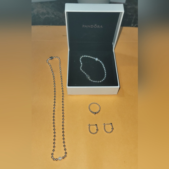 Stylish Pandora set with a silver necklace, bracelet, and earrings. Ideal for any occasion.