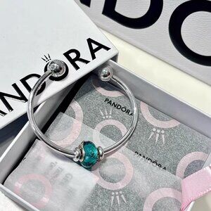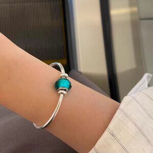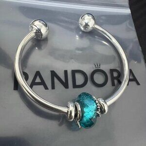 Authentic Pandora silver open bangle bracelet featuring a stunning faceted Murano glass charm in ocean blue. The sleek silver design paired with the sparkling glass charm makes it a timeless piece for everyday wear or special occasions. Adjustable fit for comfort and versatile styling.
