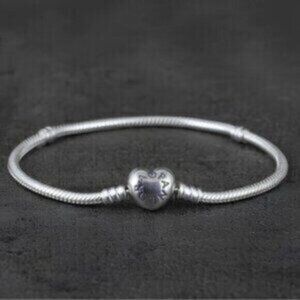 This Pandora-style charm bracelet is made of silver-colored metal with a heart-shaped clasp, featuring a smooth snake chain design.