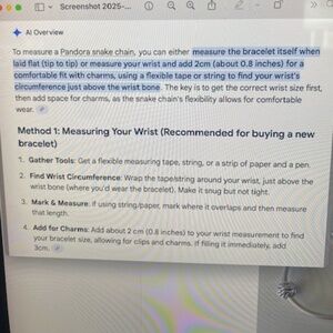 Pandora Silver Snake Chain Bracelet with 2 Spacer Charms. This is an old style Pandora snake chain bracelet in that it was purchased probably 5 to 7 years ago but it has not been worn. The 2 spacer charms detach and the bracelet can be worn without them. As seen in the photos, from tip to tip the bracelet measures around 6 3/4". On my wrist which measures around 6 1/4", it is a very snug fit. I am not sure how many more charms it can comfortably fit. If you are interested, it is very important you refer to Pandora's size chart and the AI instructions on how to measure your wrist which is also seen in the photos, and look at the photos of how it fits on my wrist which is 6 1/4" wide.