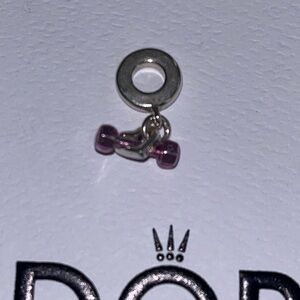 Elegant Pandora bracelet charm. Features a silver dumbbell with purple accents. Perfect for fitness enthusiasts.
