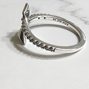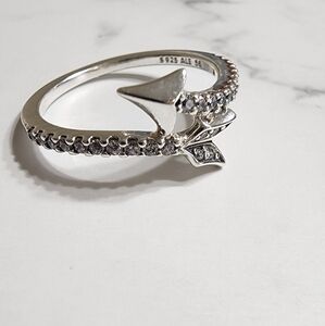 Feeling lovestruck? The Sparkling Arrow Ring features a striking Cupid's arrow motif, crafted from sterling silver. The half-pavé band elegantly mimics the shape of an arrow, complete with a polished tip and curved fletching. Stack it with other minimalist rings for a modern look or wear it solo for a statement piece with subtle symbolism.